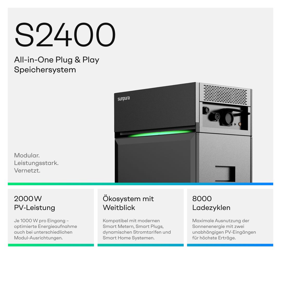 Der Sunpura S2400 vereint modernste Komponenten in einem Gerät: Micro‑Inverter, MPP‑Tracker, intelligentes BMS und langlebige LiFePO₄‑Akkus sorgen für maximale Effizienz und eine echte Plug‑&‑Play‑Lösung, ganz ohne Installationsaufwand.